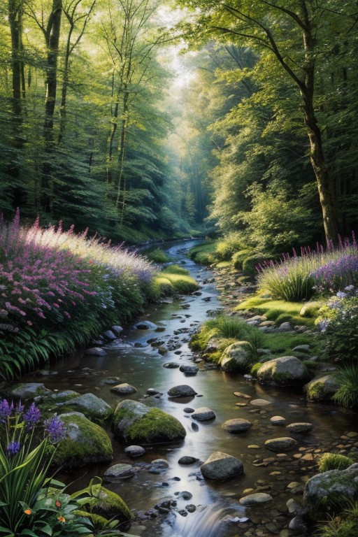 masterpiece, best quality, absurdres, illustration, photorealistic, blooming flowers, sparkling streams, fairy lights, stone pathways, enchanted flora, peaceful aura