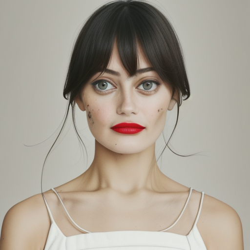 survival gear, loose strands, bruised, high fashion, wavy, delicate, gadgets, graceful, poised, gentle, minimalistic, sandbags, large eyes, gentle smile, captivating gaze, vibrant, soft lighting, rugged, red lipstick, flawless, sleeveless dress, fringe bangs, greenery, white eyeliner, intense, minimalistic background, simple, serene, snack, conflict, warrior.
