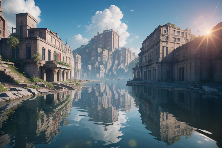 (8k, RAW photo, best quality, masterpiece:1.2), (realistic, photo-realistic:1.37), octane render, ultra high res, ultra-detailed , professional lighting, photon mapping, radiosity, physically-based rendering, ue5, ((island sanctuary)), ((ancient fallen kingdom)), ((reflections in water)), ((raytracing)), ((drowned city)), (depth of field)