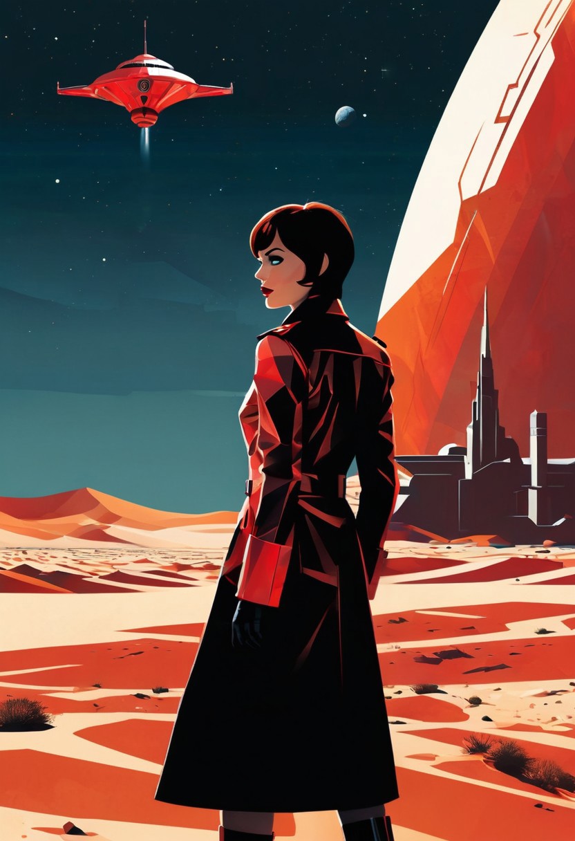 Art Deco travel poster, Mars, spaceport, bright sunlight, colonized landscape, red Martian dunes, geometric cityscape, sleek spaceships, high contrast, pulp comic style, stark shadows, silhouette, fedora, black trench coat, arriving at space port, futuresurban, <lora:futuresurban2_XL:1> spcrft, <lora:SpaceCraft_XL-000005:1> meiko, <lora:Meiko-lora-xl:0.6> dark short hair, hardboiled captions, bold typography, stylized fonts