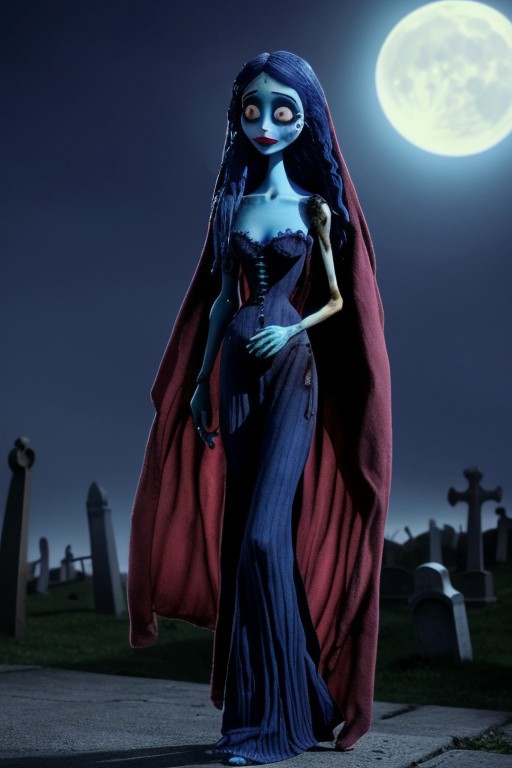 The Corpse Bride walking through a cemetery on a moonlit night. Black full length dress, Light-blue skin, big eyes, big lips, tiny nose, blue mascara, blue hair, sultry, looking at camera