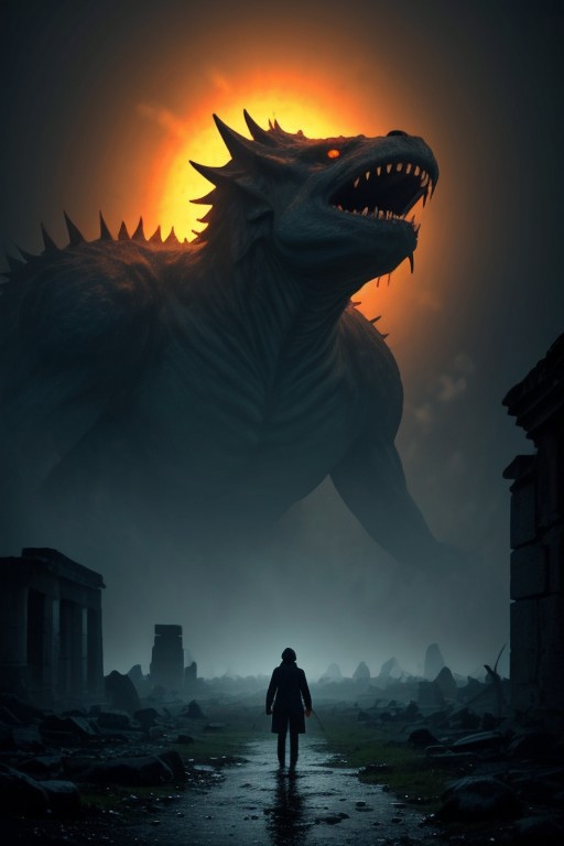 masterpiece, best quality, absurdres, illustration, photorealistic, monster, tentacles, glowing eyes,monster scream, ancient ruins, fog, dim light, eerie atmosphere,fire, orange sky, rain