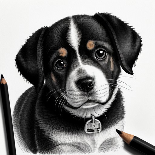 A puppy. Drawing. Ink spot. Handdrawn. Fast blur lines. Black and white.