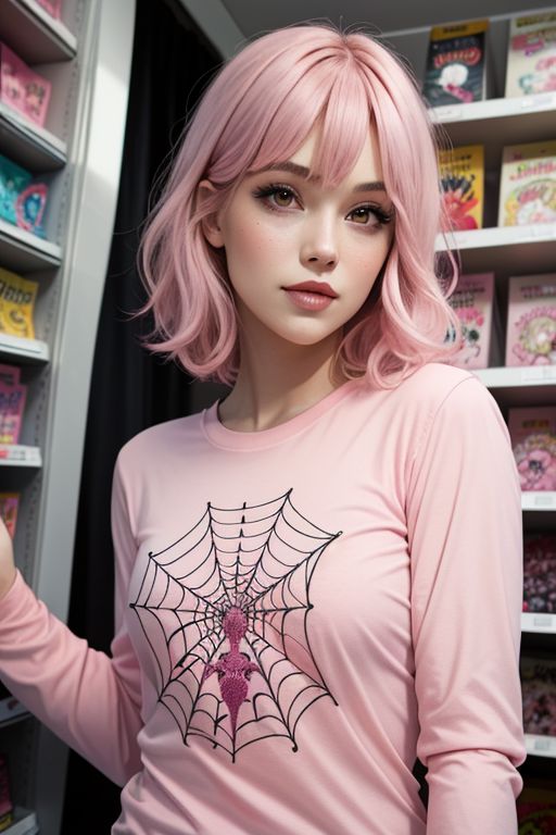 1girl, solo, spider web background, soft color, illustration anime, waved long hair, realistic, solo, short hair, pink hair, brown eyes, upper body, close-up, (pink shirt, pink sweeter, long sleeves:1.2), comic store