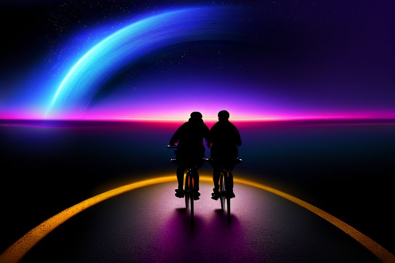 A (man and a woman) standing with their backs to the camera, side by side, (both leaning on their road bicycles) with a slight tilt. (Bicycles are positioned to the sides of each person and are visible from the back.) The scene is set under a breathtaking night sky with a narrow strip resembling a segment of Saturn's rings, starting from the center of road and tilted to the right at a 30-degree angle from the vertical. The image is in silhouette style, so the bicycles and the couple appear as dark shapes against the bright, starry background. The scale of the people should be significantly reduced, occupying no more than one-eighth of the height of the frame, giving a sense of greater distance and vastness. Use a wide-angle camera to capture the scene. cinematic light, vibrant colours