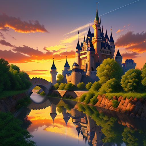 Best quality, castle, sunset,shadow, 8k, clear,warm color, river,mirror ,scenery,fantasy