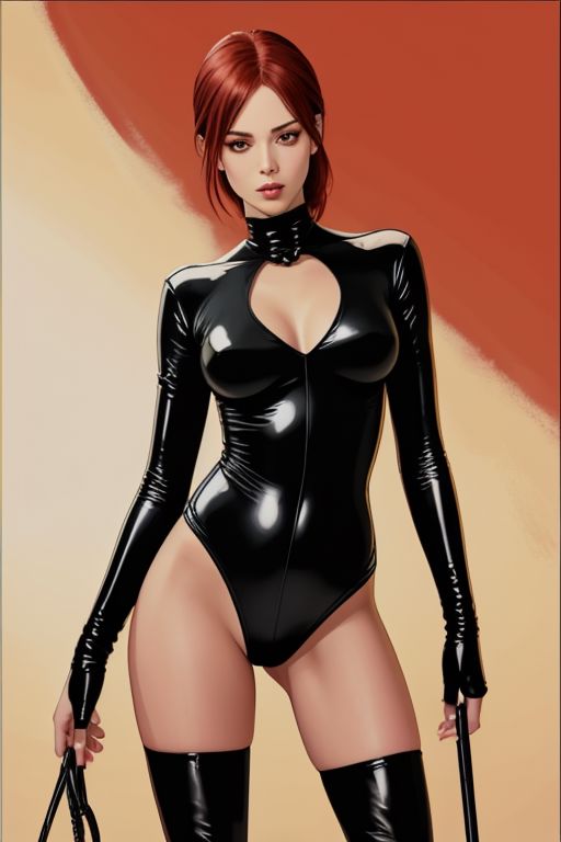 (masterpiece), (best quality), (expressive eyes), (perfect face), (sheer pantyhose), (thigh high boots), (stiletto heel), (dominatrix), (cold expression), (looking down), (voluptuous), (blank background), (large eye), (beautiful face), (delicate facial feature), (high quality), (4K), (holding riding crop), (BDSM crop), (standard human anatomy), (1 girl), (solo), (three-quarter portrait cowboy shot), (mature female), (beautiful eye), (retro anime), (red hair), (nobility)