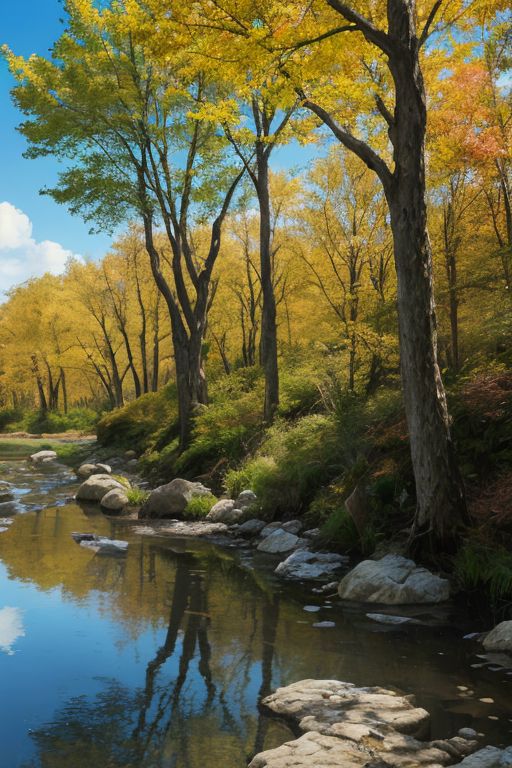 (ultra-detailed, masterpiece), best quality:1.6), (cinematic lighting, vibrant colors, sharp), forest, (creek, shore, running water, waves:1.2), (reflections on water), (smooth boulders), autumn trees, gentle breeze, sunny, white clouds, peaceful, (wide sky, large sky, blue sky:1.3), BREAK. (intricate details:1.4), OverallDetail, CS-BBz, BREAK. <lora:Ghibli_v6:1.0>