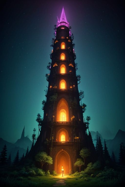a magical landscape covered in luminescent plantlife and fantastical creatures,colored faerie lights in the air,a wizard's tower