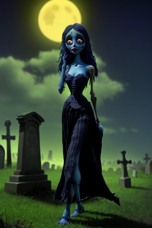 The Corpse Bride walking through a cemetery on a moonlit night. Black full length dress, Light-blue skin, big eyes, big lips, tiny nose, blue mascara, blue hair, sultry, looking at camera