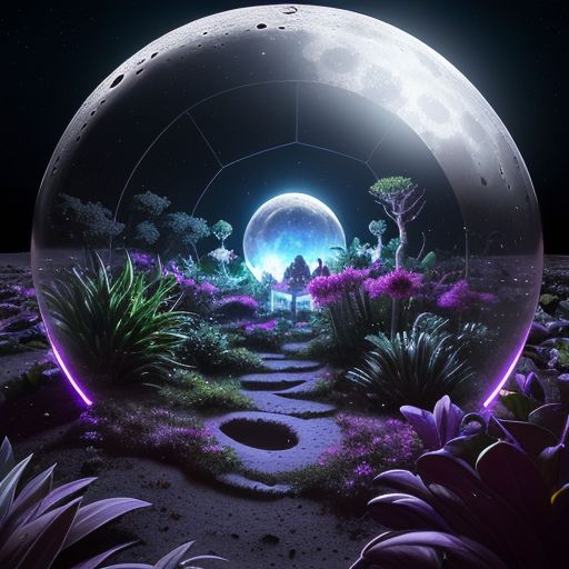 Lush vegetation covers the surface of the moon, with plants evolved to survive in low gravity and harsh conditions. Towering crystal formations dot the landscape, reflecting light and creating a stunning visual display, The lunar city is a bustling hub of activity, with transparent domes protecting its inhabitants from the harsh conditions outside. Glowing lights illuminate the city, creating a futuristic and otherworldly scene.