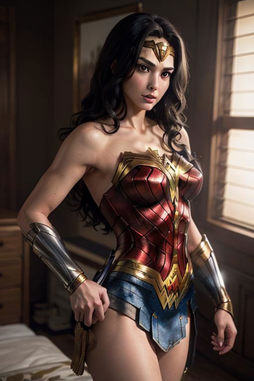 (((nude, naked))), large breast, big butt, thick legs, full body view, hairy pubic hair, ((best quality, masterpiece, ultra realistic professional lighting, ultra thin 8K, fine texture of detailed background, sharp face with perfect strokes.)), ((wonder woman inspired))