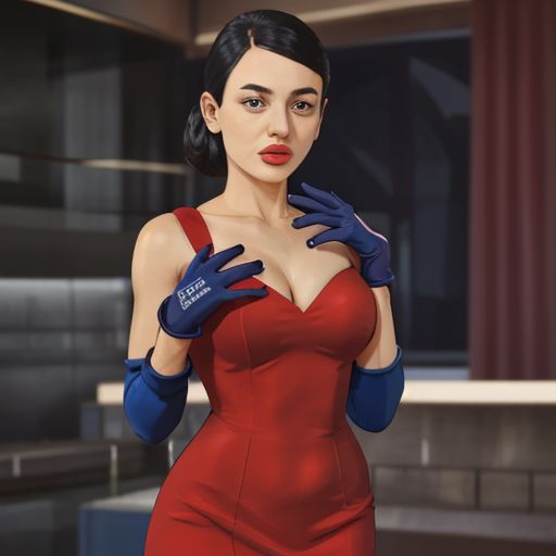 debdef, red dress, long blue gloves