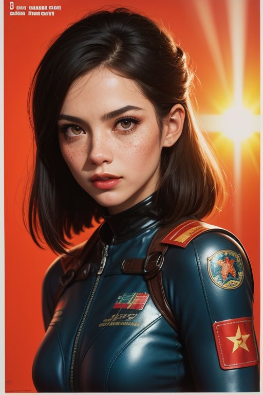 (masterpiece, best quality, hires, high resolution:1.2), (extremely detailed, realistic, intricate details, highres), 3d, cg, woman, muscular, abs, shiny skin, black hair, blush, freckles, eyeliner, eyeshadow, eyelashes, bun, plugsuit, science fiction, (huge wide breasts:1.2), (cinematic lighting, sunlight, volumetric), looking at viewer, eye-level shot, close-up shot, simple red background, vintage fantasy, 1960s \(style\), film grain, (atompunkstylesd15:1.0), (soviet poster:1.4),