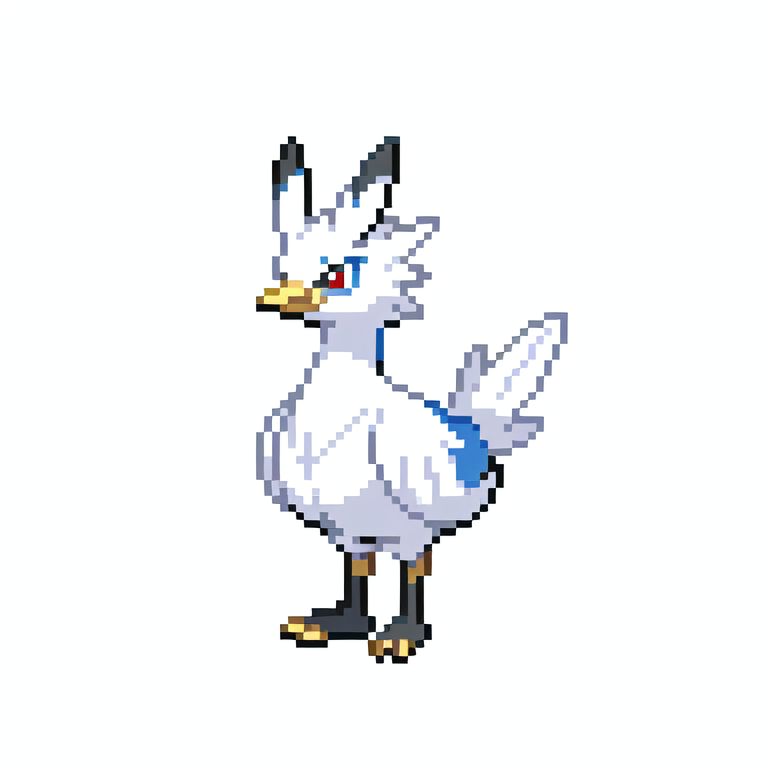 high quality, best quality, (masterpiece:1.05), (single, solo, alone, individual:1.05), front sprite, three-quarter view, (front:1.05), (full body:1.05), pixel, pixelart, (front view, standing up, fighting:1.05), <lora:pksp768_V2-1:0.6>, (white background:1.07), pokemon, gen5, white chicken, ferocious, Alkonost, seashell