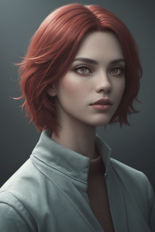 Professional photo by Richard Awedon, woman with red hair, eyeshadow, mascara, beautiful lighting, alternative composition, uncommon framing, close-up, 4k, sharp focus, high resolution, realistic detailed skin, detailed eyes, deep cleavage, 8k UHD, DSLR, high quality, dark hues, silverteal palette, low key,backligh, atmospheric haze, cinematic style