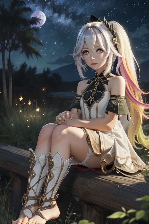 naxida, 1girl, solo, thighhighs, looking at viewer, multicolored hair, gradient hair, dress, long hair, feet, blonde hair, no shoes, bare, shoulders, lips, nice hands, perfect hands, toes, blushing, sitting, full body, in the night, good lights, fireflies, realistic, cartoon, anime, cartoon-anime,