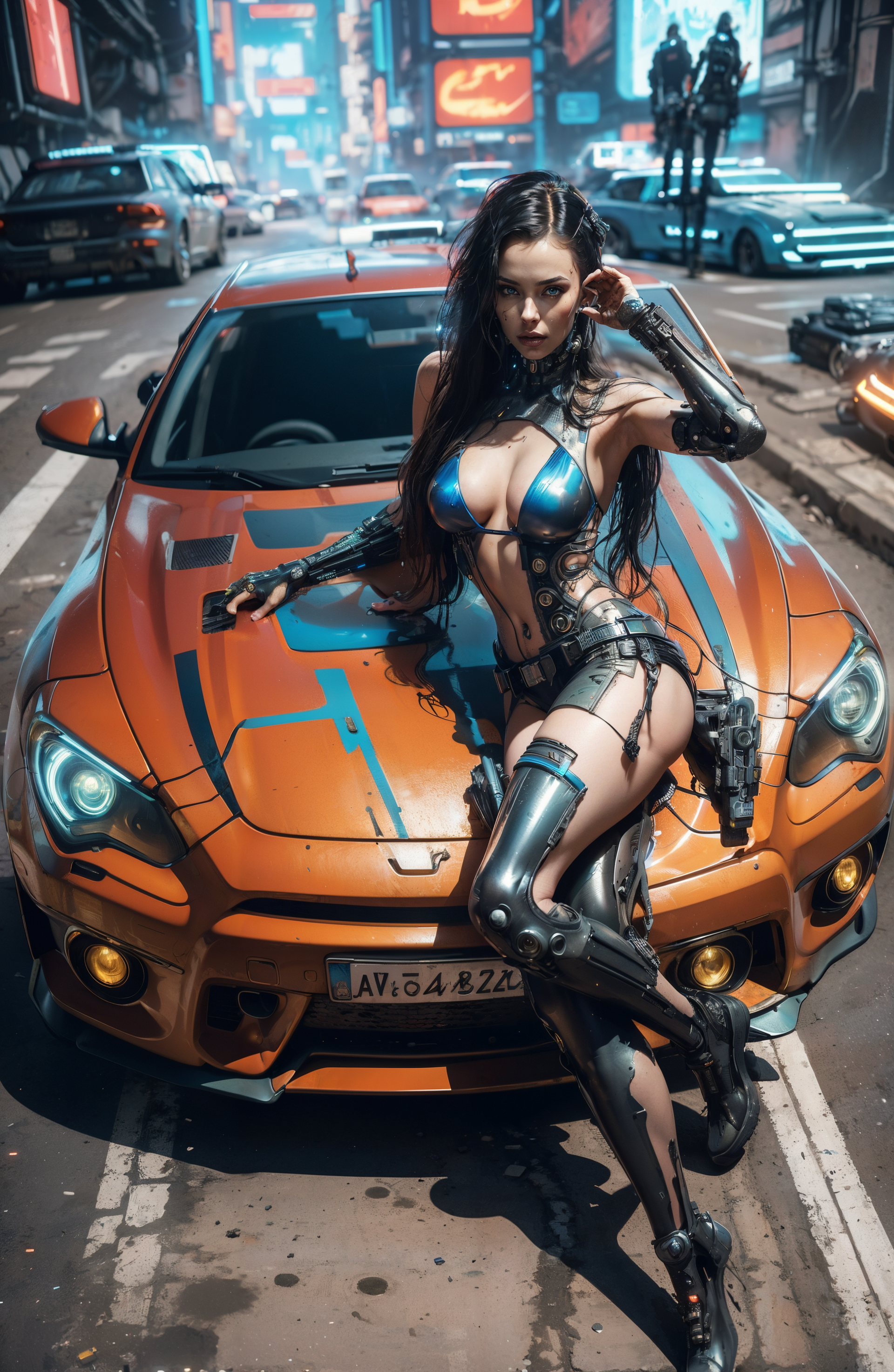 (masterpiece, top quality, best quality, official art, beautiful and aesthetic:1.2), (1girl), extreme detailed, a woman (dynamic action pose:1.2) next to a blue car, (cyberpunk art by Maciej Kuciara:1.4), cgsociety, neogeo, anime aesthetic, anime, synthwav, colorful,highest detailed, <lora:cargirl_lean_ahead:0.8>, <lora:white mecha_20230730131626:0.5>