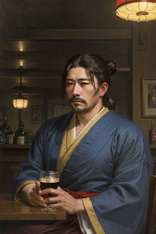 a painting of a (Japanese man:1.1) by Sgnc, samurai, blue robes, indoor, stubble, unkempt hair bun, (old-aged) (masculine:1.3), burned face, somber expression, depressed, depression, looking into glass of whiskey, seated in a Welsh pub, <lora:cabanel_resize:1>