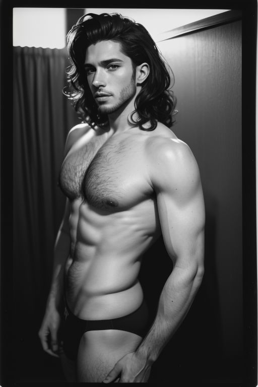 nsfw, polaroid photography, stunning man, black wavy hair, posing, facing camera, underwear, A cinematic nod to a retro aesthetic, featuring a handsome man in a vintage costume, revealing costumes, A Studio 54 costume, film grain, chiaroscuro, perfect anatomy, gay, homoerotic, sexual tension