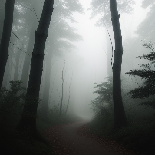A dense, mysterious forest shrouded in thick fog, with towering trees whose tops are hidden in the mist. Soft, diffused light filters through the fog, creating an ethereal glow. A narrow, winding path leads deeper into the forest, where shadows of unknown creatures flicker in the distance. The atmosphere is serene yet eerie, with the sounds of distant whispers and rustling leaves