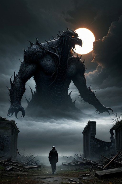 masterpiece, best quality, absurdres, illustration, photorealistic, 1other, monster, eldritch monster, shadowy figure, glowing eyes, tentacles, crumbling ruins, eclipse, ominous clouds