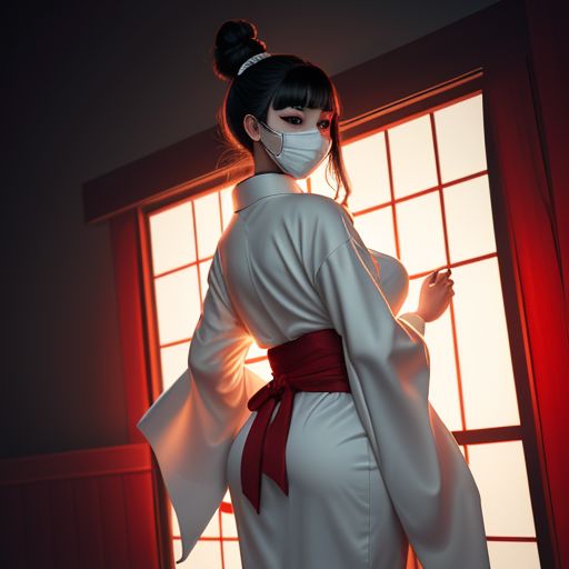 high res, good quality, accurate face, ((high resolution:1.2), (hi-res:1.2), masterpiece, best quality), The Lady (Little Nightmares), Tall woman, wearing a white solid porcelain mask , Sexy woman, Long kimono, Masked face, dimly lit room, Red bra, long black hair, Red panties, wearing a white porcelain mask, hair bun, Magical powers, Thick thighs, massive ass, curvy, stripping, video game character, Little Nightmares, Red kimono , porcelain mask , Taller woman, in a dark room,