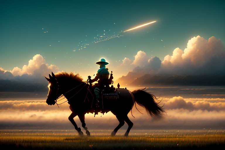 Amazing scene of a massive UFO emerging from the clouds over the Wyoming prarie, (the silhouette of a cowboy on horseback is in the distance and backlit by light from the spaceship), view is looking slightly up a slope past the cowboy and focused on the sky, Unbelievable detail, the underside of the UFO is intricate and has patterns of lights, the ship is reflective like silver, godrays, bloom lighting, ultra realistic, 8k, highest quality, masterpiece,