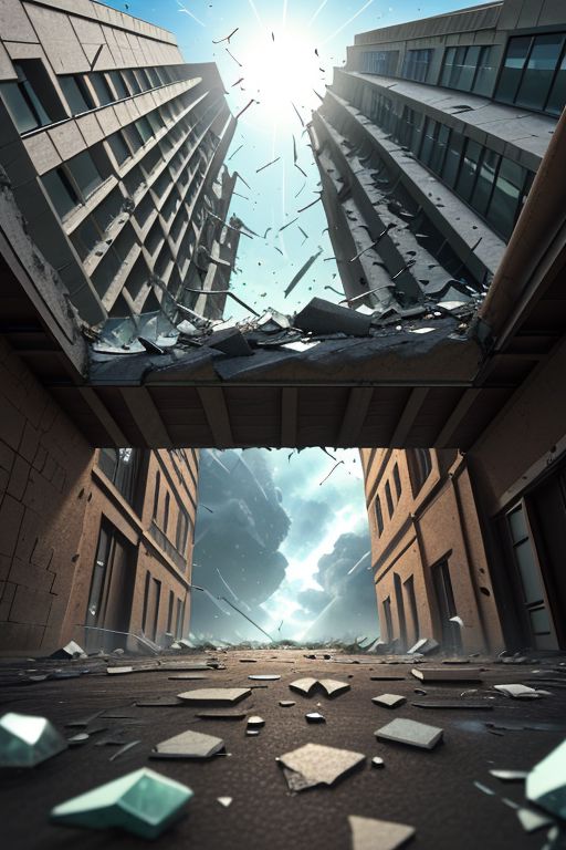 <lora:ChaosEngine-v1:0.4>, layers of buildings and (broken glass and crumbling stone), view from below, (suspended above ground), ultra realistic, 4k textures, dutch angle, dolly zoom, lens flare, building falling, tornado in the background