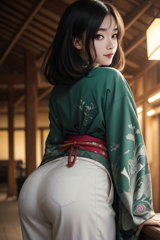 gorgeous lips, cinematic, (masterpiece), (best quality), (ultra-detailed), very aesthetic, illustration, perfect composition, intricate details, absurdres, detailed face, (anime, masterpiece, intricate:1.3), (best quality, hires textures, high detail:1.2), (4k),(incredibly detailed:1.4) (beautiful detailed face, beautiful detailed eyes) villain, 1woman, arrogant smile high pointed nose, (nostrils:1.3), patterned bra, blurry, no bra, 22-year-old woman, pale skin, black eyes, bob black hair, big brests green kimono, pelvic curtain on ass, large ass, from behind, outdoors, dimly lit,