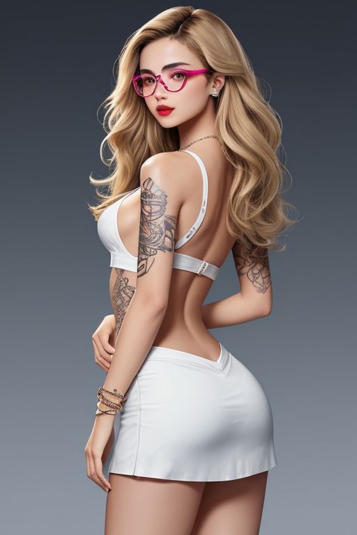 She is a medium-height very seductive woman with a slim, curvy build. Her long, wavy blonde hair cascades down her back. She has soft green eyes, fair porcelain-like skin, and a heart-shaped face with high cheekbones, a small nose, and full lips with light pink lipstick. She wears a sexy and very revealing provocatively stylish lab coat, slightly open to reveal a low-cut blouse and a short skirt. Her attire is white with light blue accents, balancing professional and seductive. She accessorizes with high-tech glasses, a bracelet, a pendant necklace, and high heels that highlight her legs. She has a small DNA helix tattoo on her wrist. Her posture is relaxed and confident, with graceful captivating smile. She exudes a blend of intellect, elegance, and provocative sexy style, making her irresistibly alluring.