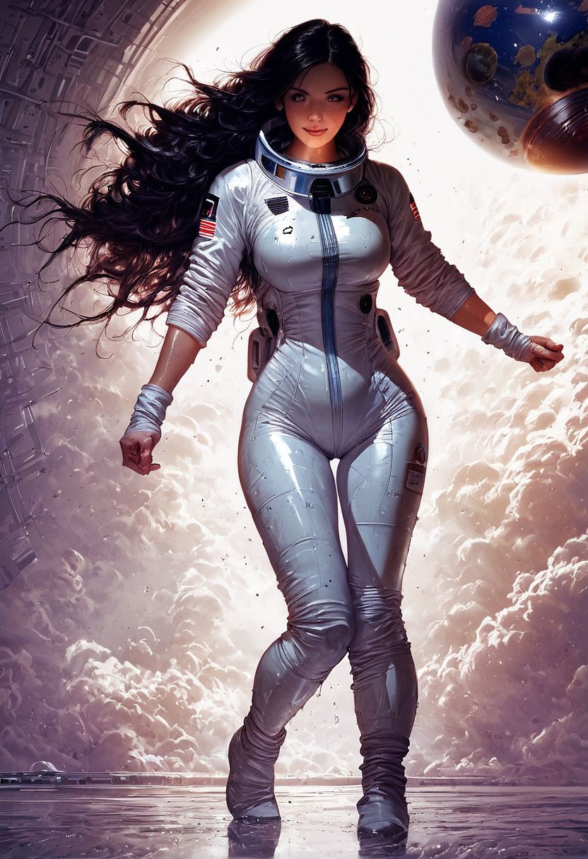 score_9, score_8_up, score_7_up, full body sexy pose, stand, 1girl, black hair, very long hair, crazy flowing hair, spacesuit, Holding an astronaut helmet in your hands, shiny skin, wet skin, normal breasts, eye contact, skinny girl with perfect body cute, Astronaut suit, astronaut, in international space station, tilted angle, moody lighting, full body sexy pose, window, professional lighting, science fiction, perfect quality, high quality, photorealistic, orange and blue hue, (((supermodel))),((goddess))