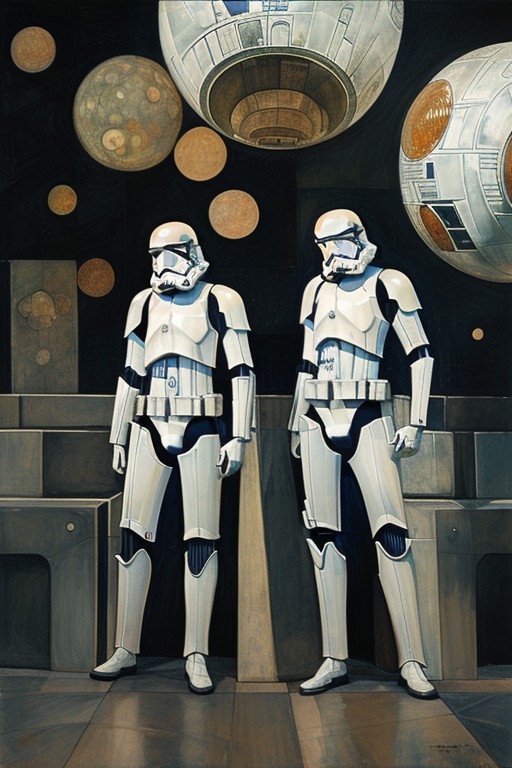 masterpiece,best quality,<lora:tbh267-:0.8>,illustration,style of Jan Toorop stormtroopers on the death star