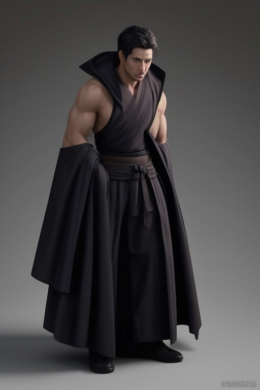 A male with short black hair, bronze skin, and strong build. Wear black Chinese robes and black trousers. FHD, masterpiece, realistic style.
