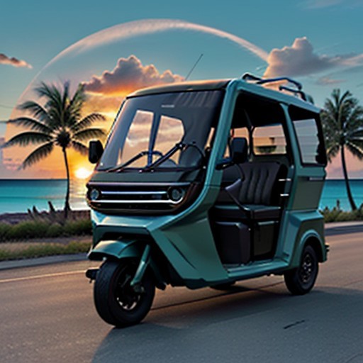 tshirt design, simple background, Vega ETX, 3wheeler, three wheeler, tuktuk, An imaginative and whimsical t-shirt design, featuring a classic and elegant Black Lowrider, the car is surrounded by a lush tropical paradise, with swaying palm trees and a breathtaking sunset sky, exuding a sense of relaxation and fun. This cheerful design perfectly captures the essence of good times and relaxation during the weekend, retro_tshirt , tshirt design , simple background