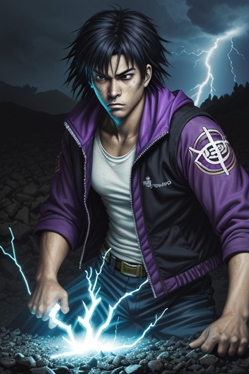 zeidmoon, serious, clenched fist, black hair, purple jacket, white tank top, (dark and gritty:1.2), (japanese manga:1.4), (hero:1.3), (lightning powers:1.1), neon, detailed textures, high quality, high resolution, high precision, highly detailed, <lora:elzeid:1>