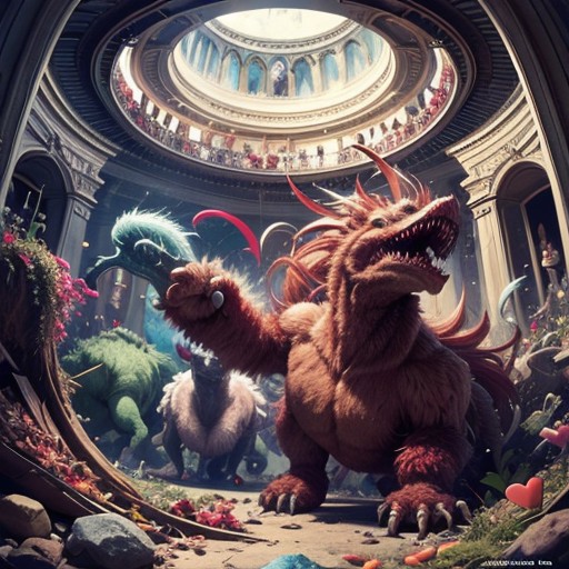colourful long haired monsters in a chaotic valentines wonderland, full colour magazine photo, 1958, ral-dissolve, linquivera, liiv1