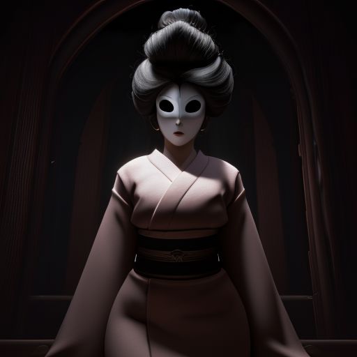 high res, good quality, accurate face, ((high resolution:1.2), (hi-res:1.2), masterpiece, best quality), The Lady (Little Nightmares), Tall woman, wearing a white solid porcelain mask , Sexy woman, Long kimono, Masked face, dimly lit room, Red bra, long black hair, Red panties, wearing a white porcelain mask, hair bun, Magical powers, Thick thighs, massive ass, curvy, stripping, video game character, Little Nightmares, Red kimono , porcelain mask , Taller woman, in a dark room,