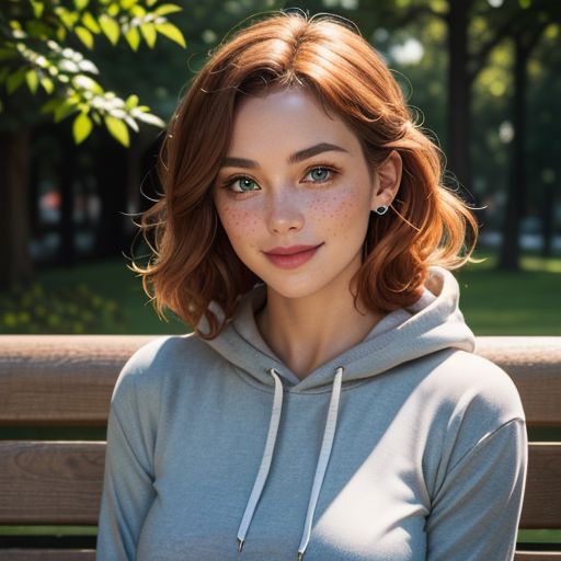 a close-up portrait of Felicia as she sits on a bench on a park, her face would be the focal point. Her complexion is adorned with a delightful sprinkling of freckles across her cheeks and nose, adding a whimsical charm. She has a straight nose with a pin nostril piercing, set with a ruby, which adds a bold and unique touch to her appearance. Her deep green eyes shine with captivating intensity, framed by naturally arched eyebrows. Her wide lips are slightly upturned in a warm, playful smile. Close-up portrait of a woman in her early 40s, natural ginger hair with slight waves, (ginger), (red hair), face adorned with freckles, straight nose with ruby nostril piercing, ((ruby nostril piercing)), deep green eyes, wide lips with a warm, playful smile, wearing AirPods, light gray hoodie visible at neckline, soft natural lighting, smooth fair skin, highly detailed, outdoors, photorealistic.
