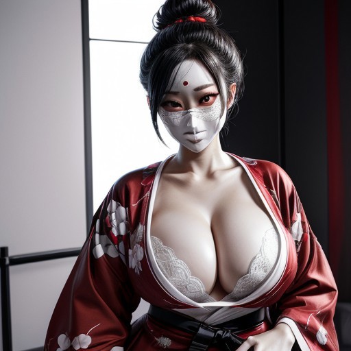 high res, good quality, accurate face, ((high resolution:1.2), (hi-res:1.2), masterpiece, best quality), The Lady (Little Nightmares), Tall woman, wearing a white solid porcelain facewear , Sexy woman, Long kimono, Masked face, dimly lit room, Red bra, long black hair, Red panties, wearing a white porcelain mask, hair bun, Thick thighs, massive ass, curvy, stripping, video game character, Little Nightmares, Red kimono, Taller woman, in a dark room, FastNegativeV2, anatomical-illustration, ng_deepnegative_v1_75t, easynegative,