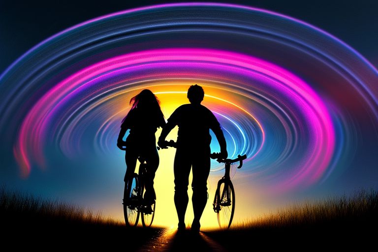 A (man and a woman) standing with their backs to the camera, side by side, (both leaning on their (road bike)) with a slight tilt. (Bicycles are positioned to the sides of each person and are visible from the back.) The scene is set under a breathtaking night sky with a narrow strip resembling a (segment of Saturn's rings, starting from the center of road and tilted to the right at a 30-degree angle from the vertical). The image is in silhouette style, so the bicycles and the couple appear as dark shapes against the bright, starry background. The scale of the people should be significantly reduced, occupying no more than one-eighth of the height of the frame, giving a sense of greater distance and vastness. Use a wide-angle camera to capture the scene. cinematic light, vibrant colours