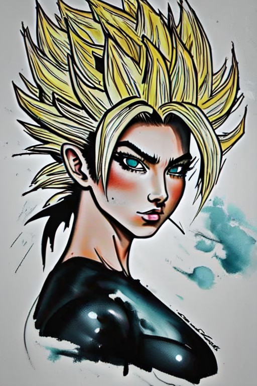 Ink style, caulifla, 1girl, solo, aqua eyes, blonde hair, spiked hair, big hair, super saiyan