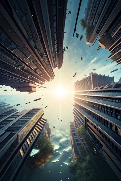 <lora:ChaosEngine-v1:0.4>, layers of buildings and (broken glass and crumbling stone), view from below, (suspended above ground), ultra realistic, 4k textures, dutch angle, dolly zoom, lens flare, skyscrapers sticking out of water, flooded city