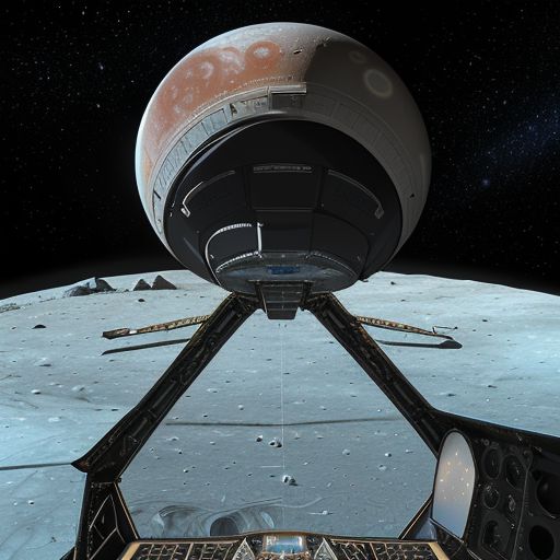 on the surface of europa moon, above the glacier, in cockpit view of spaceship, dark space with some stars in front, lights shining on landing pad, cockpit is detached from landing platform