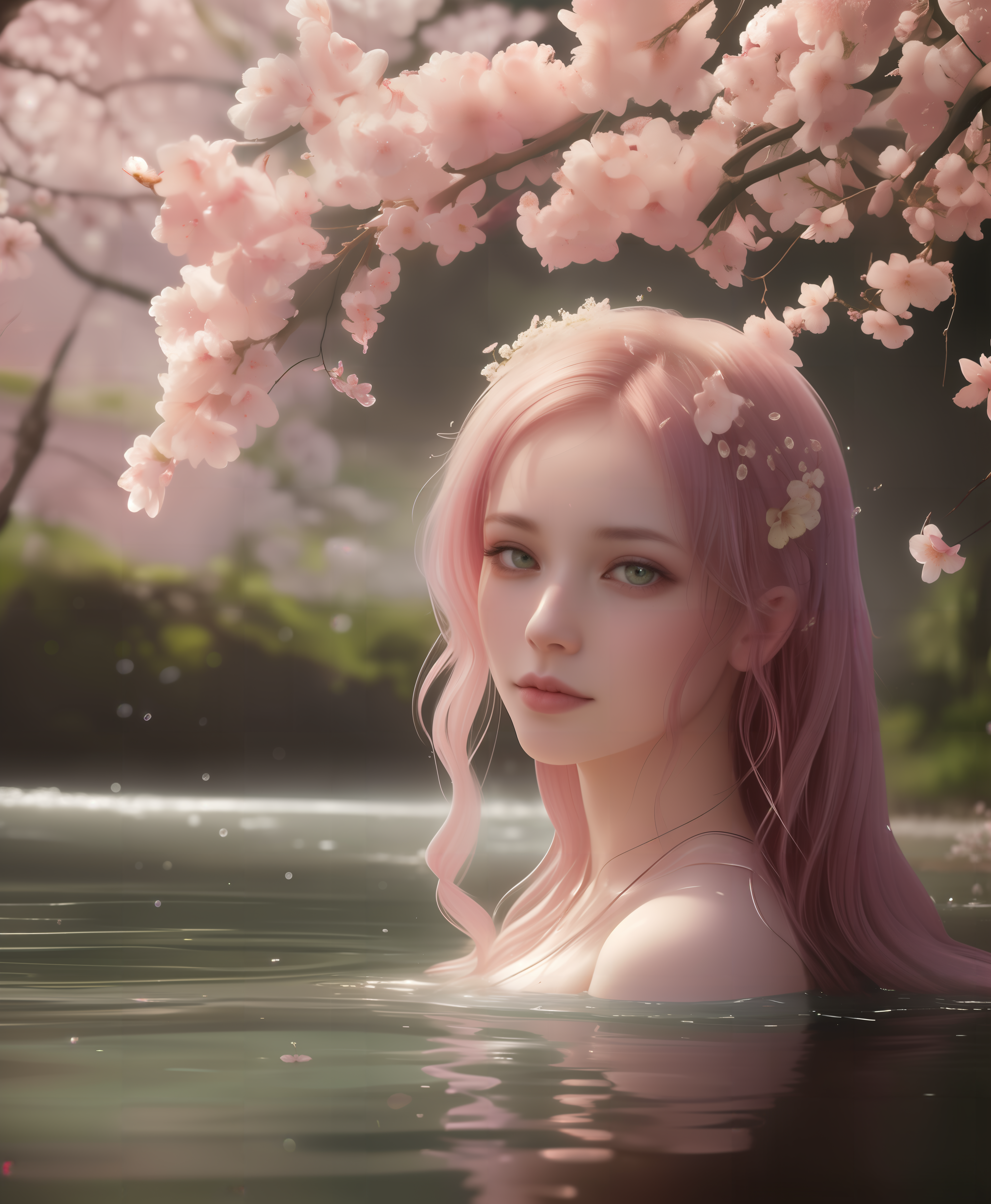 iphone photo, cherry blossom festival, 1girl, woman washing in river, looking from inside the cherry blossom, ((green eyes)),(intricate details:1.20), (hdr:1.50), (hyperdetailed:1.30), (cinematic shot:1.50), (vignette:1.10), (centered composition:1.25),