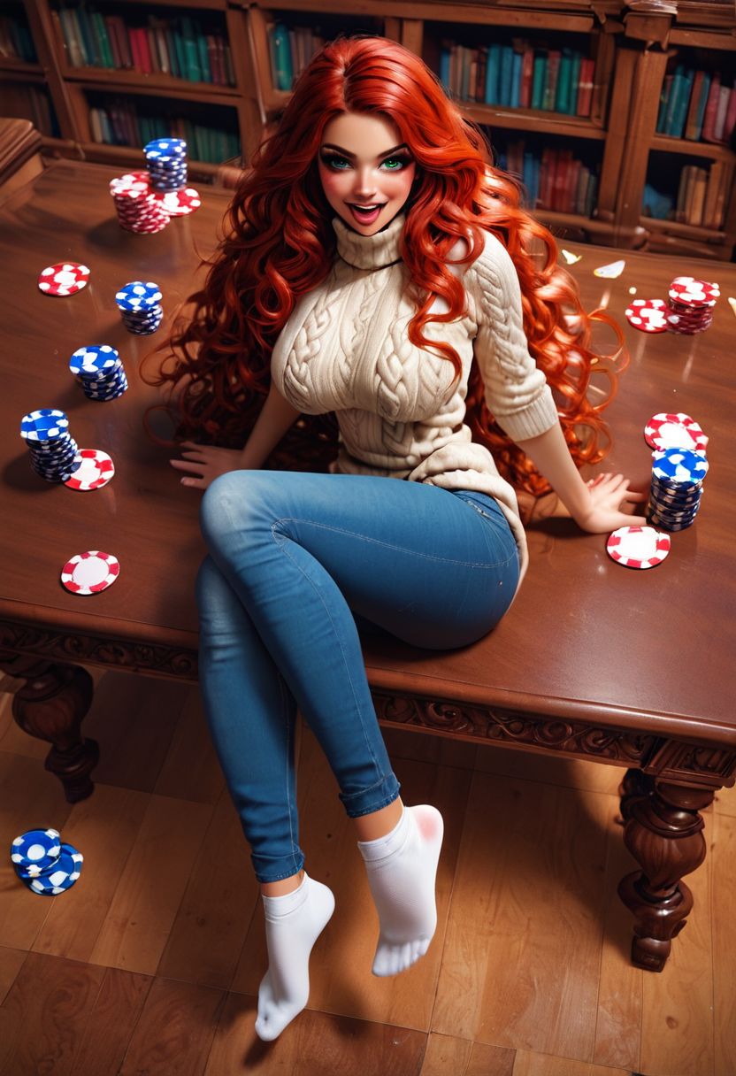 score_9, score_8_up, score_7_up,score_6_up, rating_questionable, 1girl, solo, d4rk4utumn, red hair, green eyes, auburn red hair, wavy hair, sparkly green eyes, eyeliner, eyeshadow, mascara, pink lipstick, tan, (((oversized aran knit sweater))), ((turtleneck sweater)), tight jeans, long jeans, ((white socks)), sock feet, gold bracelet on right wrist, feet up in air, flirty, horny, mischief, naughty, inviting, blushing, ((laughing)), sitting, poker cards, poker chips, table, bookshelf, large breasts, thin waist, bubble butt, long legs, indoors, daytime, in a library, full body, view from above,