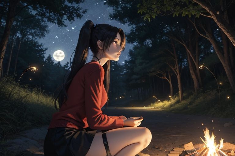 <lora:tohsakaRinFate_v10:0.7>,(RinTohsaka),black hair, black skirt, red sweater,serious expression,twintails,(1girl:1.3),solo,ass,bangs,black thighhighs,jewel-like blue eyes,looking at viewer,star-like clusters of vibrant glowing fireflies, rin tohsaka sitting on a log bench outside at night kneeling infront of a campfire, capture the dim moonlight casting deep shadows throughout the trees,one hand resting on chin, clearing in the forest, looking back at viewer, realistic,sitting,lips,looking at viewer, studio ghibli, fireflies, nice hands, thigh strap, perfect hands, dark forest path, (side view:1.5), landscape portrait,side hand,