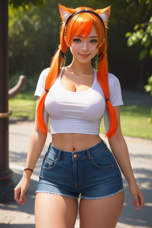 (best quality, masterpiece:1.3), (((3 GIRLS))), ((THEY ARE 3 DIFFERENT LOOKING GIRLS))) absurd-res, RAW photo, 16K photo album, (realistic, photo realistic:1.2), blurry background, incredible beautiful Canadian girl, a really cute Canadian girls, youthful, , extremely detailed beautiful face and large black eyes, medium hair, (((realistic straight multi color colorful flashy orange hair))), twintails , cute pink shirt show a nice detailed cleavage, small perky breasts, narrow waist, slender body, clear and smooth skin, perfect figure, wearing red tight-fitting t-shirts, her t-shirt pushes up her breasts, very tight short denim shorts, looking at viewer, standing, (shy smile), at the zoo, (thigh shot), shot from diagonally front, shot from below, close-up photo, (((very large thighs gap))), ((very large hips, round hips)) , big butt, navel piercing, cat ears headdress, (((large crotch gap))), she has ghetto tattoos, cute black cat eyeliner, (visible thong straps), random pose, very small shoulders, she has freckles