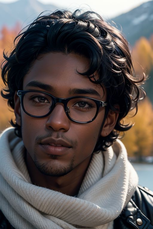 Portrait of Jair, 1boy, male,, male focus, age:30, 5'7", 170 lbs, short curly hair, black hair, (dark skin:1.7), brown eyes, thick arched eyebrows, wide button nose, thin lips, facial hair, glasses, white scarf, gray coat, (close-up:1.4), outdoors, lakeview, mountains, autumn, blurred background.
