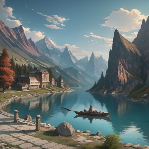 the lake, small town buildings, boat, road, stones,rocks,mountains, high detail, vibrant colors, fantasy, epic realistic, complex background, art by Greg Rutkowski